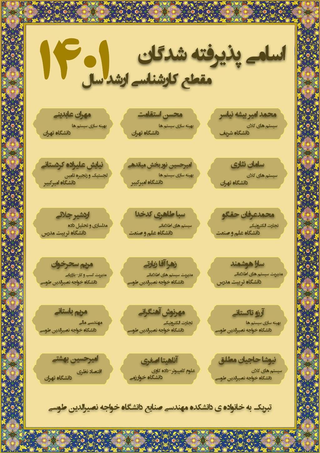 اعلام اسامی پذیرفته شدگان مقطع کارشناسی ارشد سال 1401 - دانشکده مهندسی صنایع