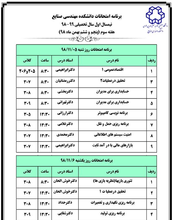برنامه امتحانات دانشکده مهندسی صنایع نیمسال اول سال تحصیلی 99-98 هفته سوم (5 و 6 بهمن ماه 98)