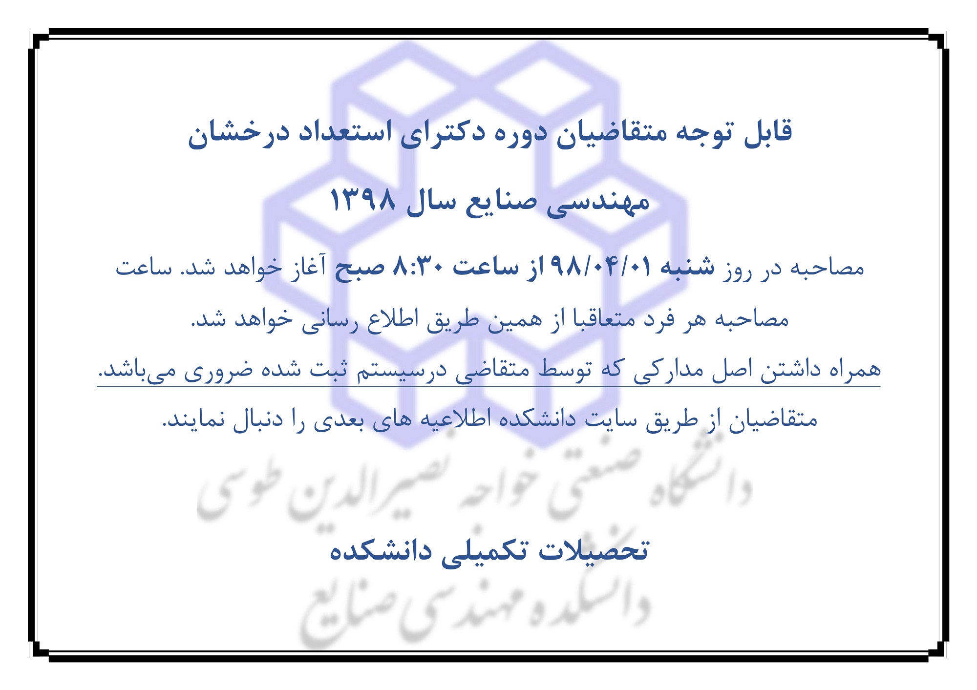 (*جديد) اطلاعيه شماره 4- برنامه زمانبندي مصاحبه علمي متقاضيان آزمون دكتري (رشته مهندسي صنايع)