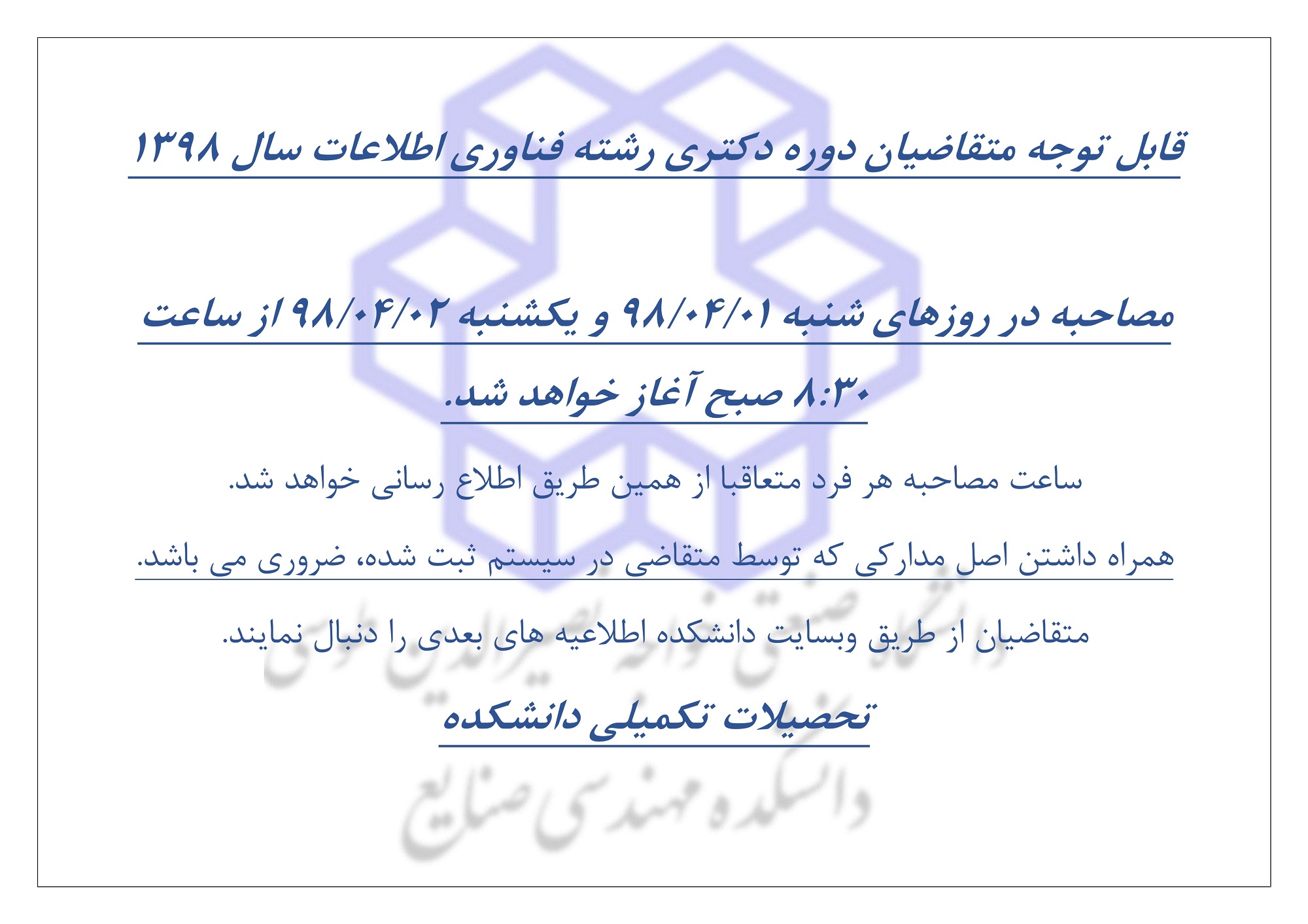 (*جديد) اطلاعيه شماره 5- برنامه زمانبندي مصاحبه علمي متقاضيان آزمون دكتري (رشته فناوري اطلاعات)
