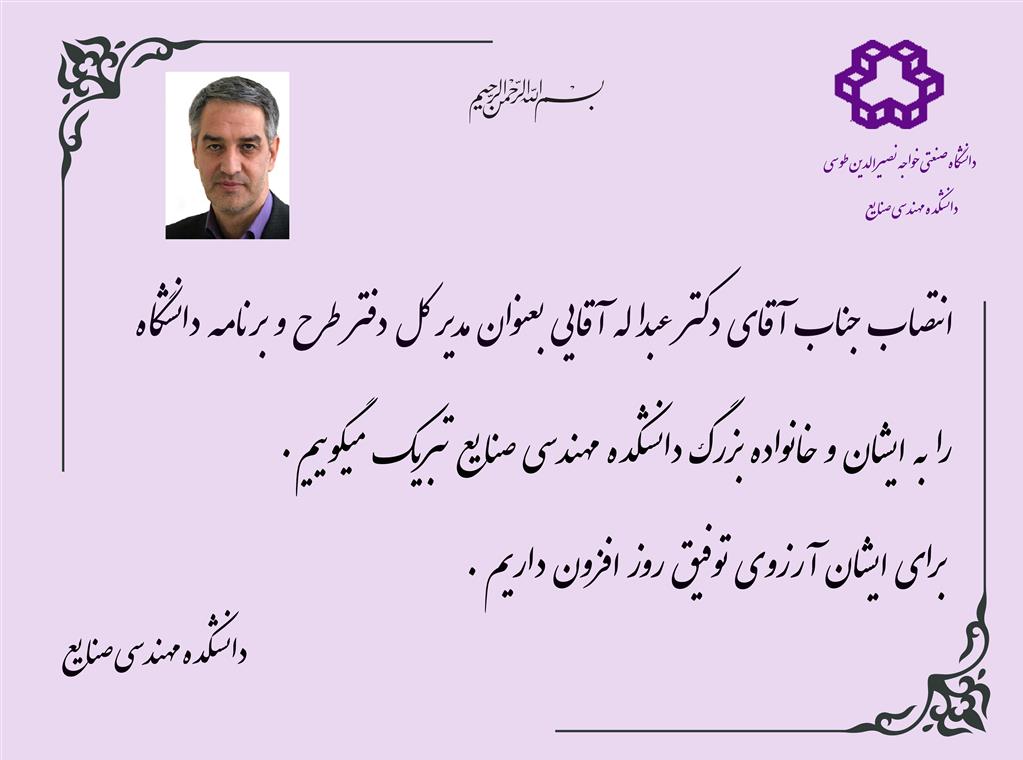 پیام تبریک انتصاب جناب آقای دکتر عبداله آقایی به سمت مدیرکل دفتر طرح و برنامه دانشگاه - دانشکده مهندسی صنایع