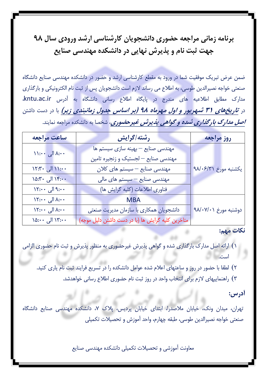 برنامه زماني ثبت نام حضوري دانشجويان كارشناسي ارشد ورودي سال 98 - دانشکده مهندسی صنایع