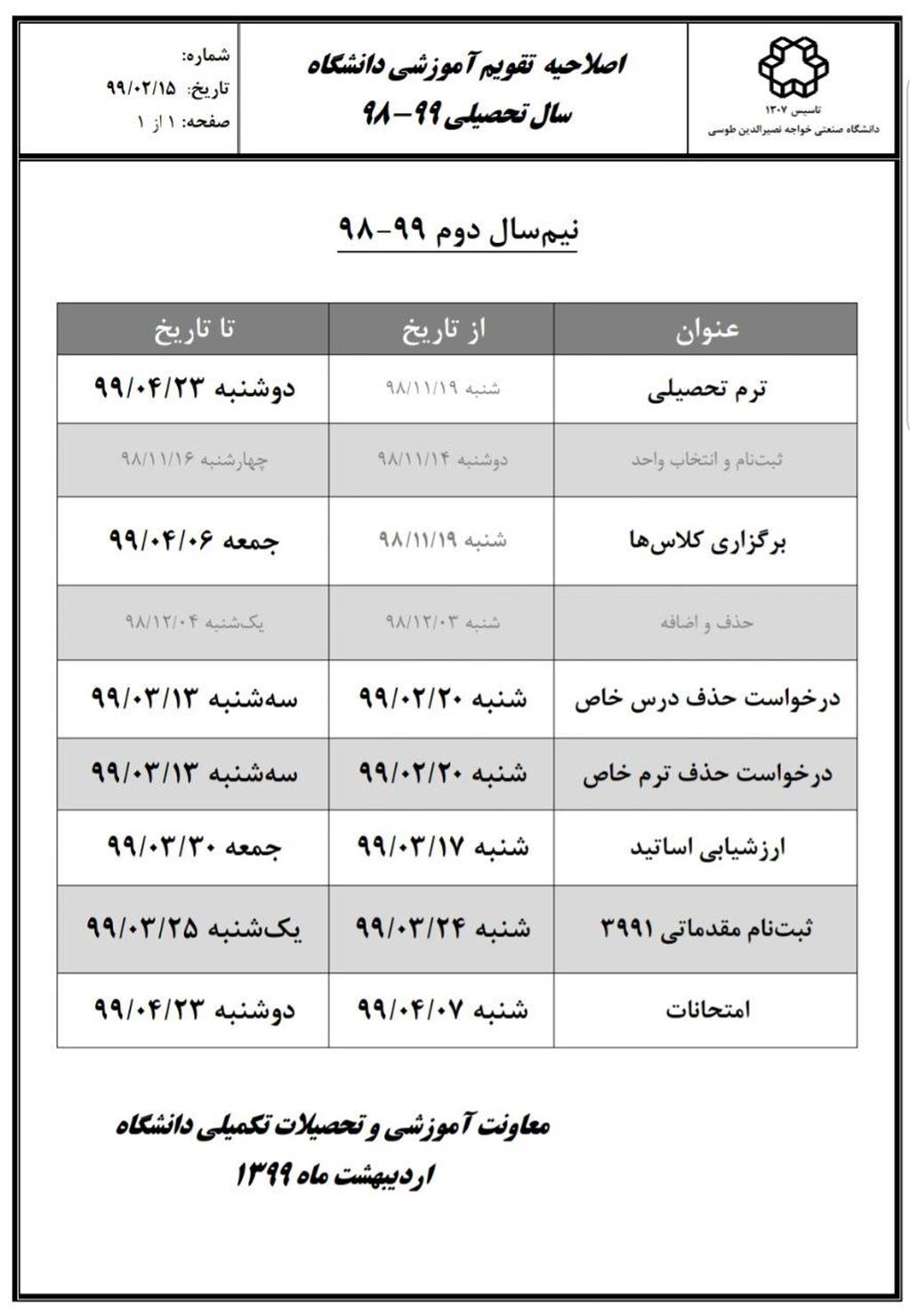 تقویم آموزشی دانشگاه، نیمسال دوم 98-99