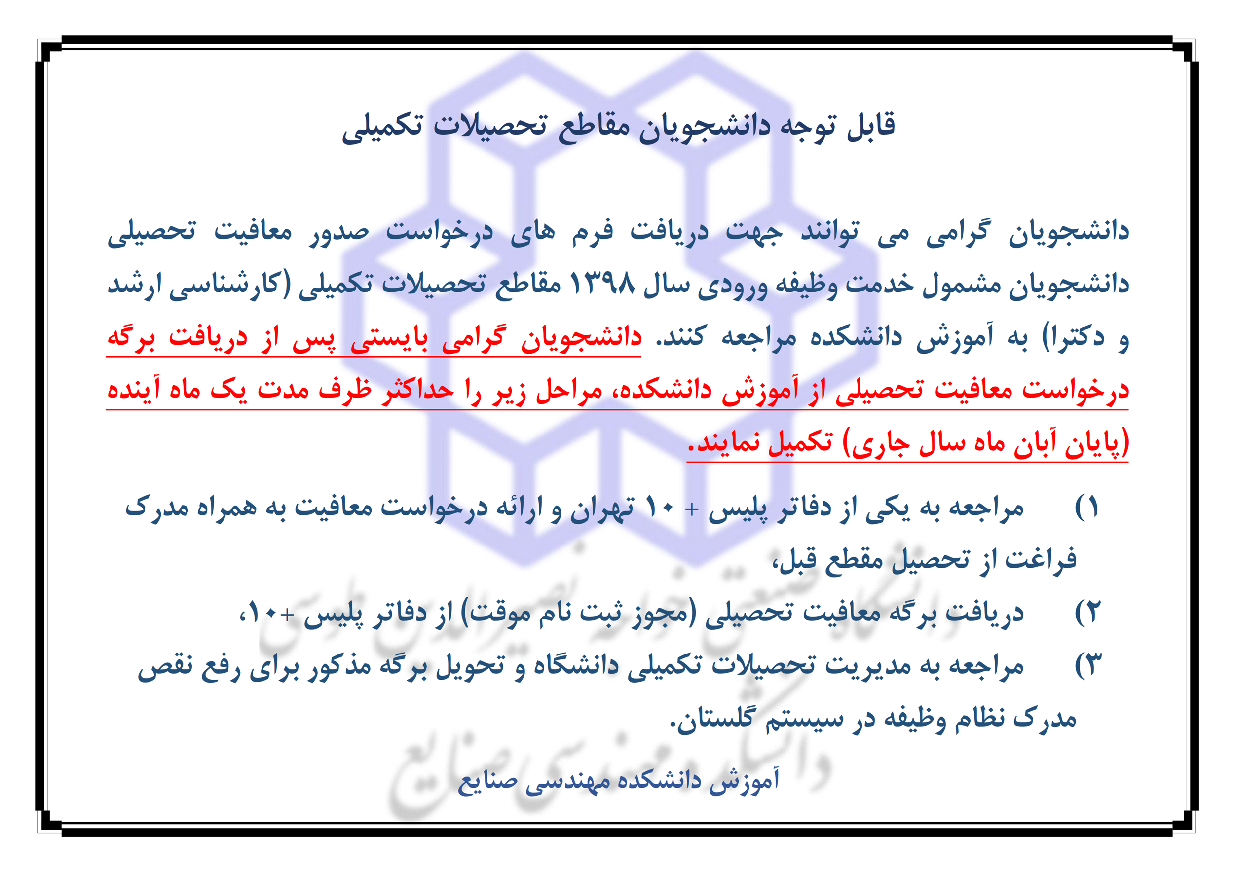 درخواست صدور معافيت تحصيلي براي دانشجويان تحصيلات تكميلي (سال 98) - دانشکده مهندسی صنایع
