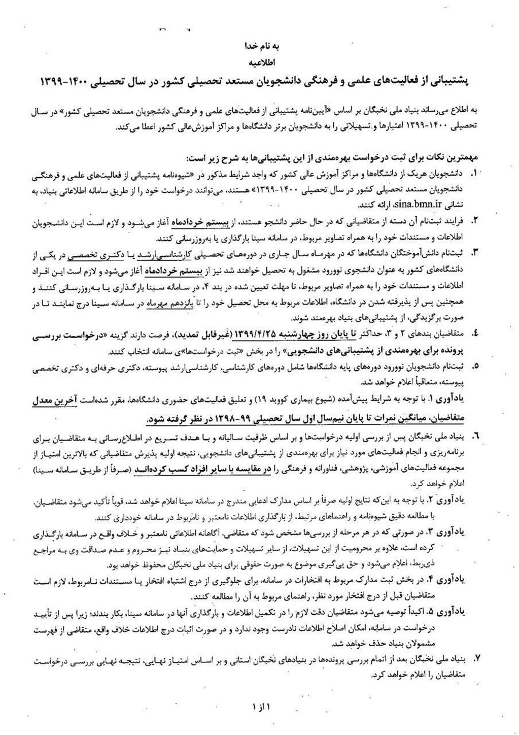 فراخوان ثبت نام برای بهره مندی از تسهیلات دانشجویی بنیاد ملی نخبگان در سال تحصیلی 1400-1399