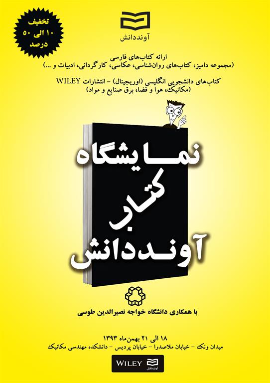 به اطلاع ميرساند با همكاري دانشگاه و انتشارات آوند دانش (نماينده انتشارات وايلي در ايران) نمايشگاه كتابهاي دانشجويي از تاريخ شنبه 18 تا سهشنبه 21 بهمن ماه در محل دانشكده مكانيك برگزار ميشود. لازم به ذكر است كتابهاي نمايشگاه با تخفيف 10 تا 50 درصدي ارائه ميشوند.