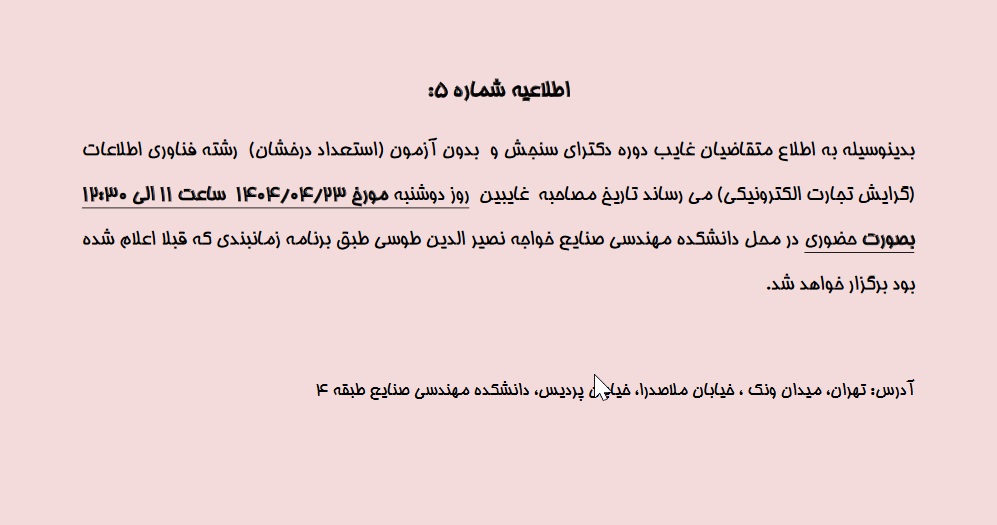 اطلاعیه شماره ۵ :جلسه غایبین مصاحبه ی دکترا سال ۱۴۰۴ گرایش فناوری اطلاعات (با آزمون - استعداد درخشان)